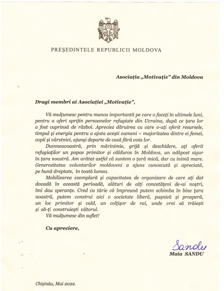 Asociația „MOTIVAȚIE” din Moldova a primit recent o scrisoare de mulțumire de la Președinta RM, dna Maia Sandu. Ne bucurăm mult pentru această apreciere înaltă pentru sprijinul oferit persoanelor refugiate din Ucraina pe timp de criză.